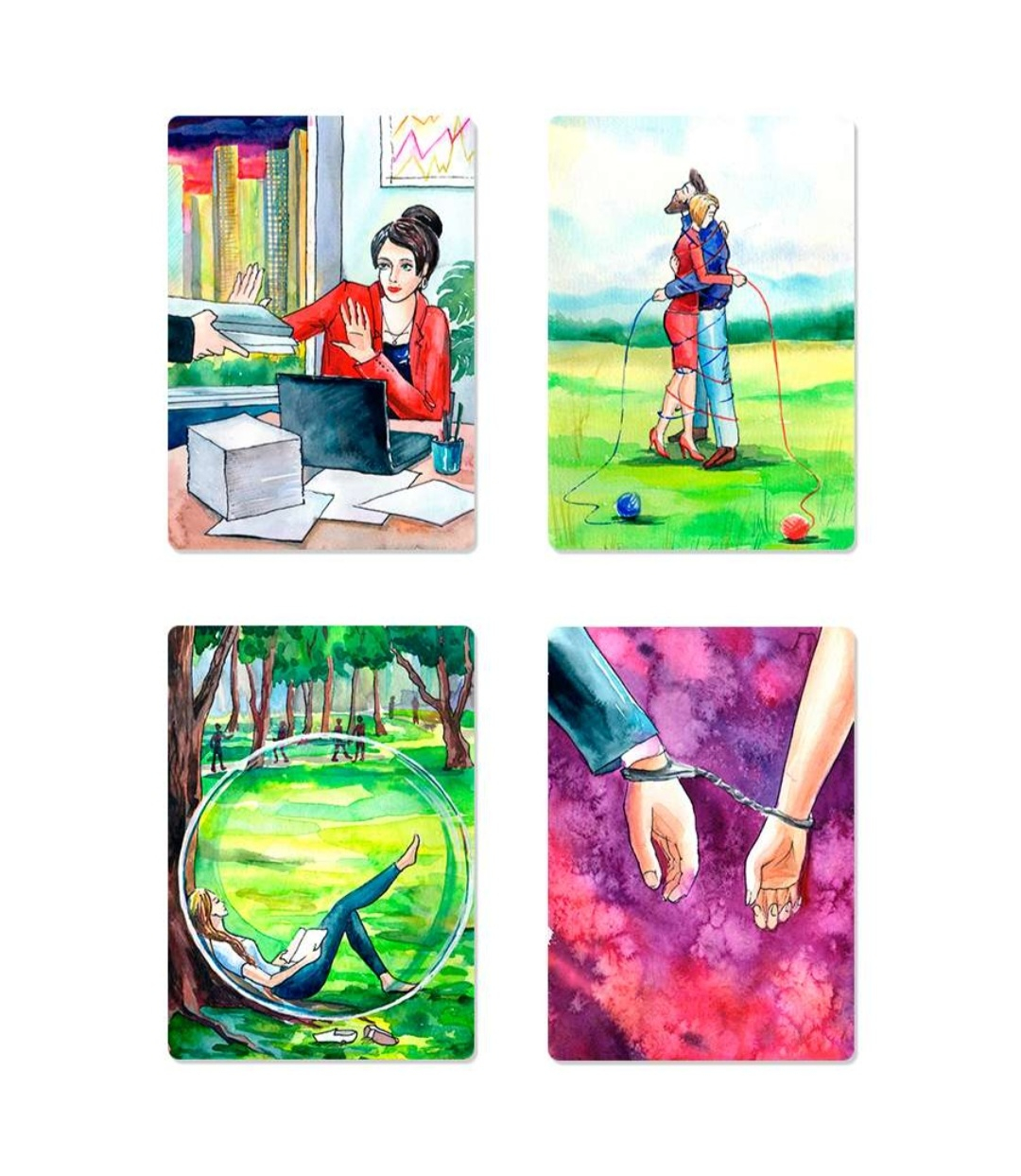 Setul include 100 de carduri cu imagini care reflecta granițele dintre oameni. În sensul direct, granițele reprezinta distanța din relații. Mărimea graniței este mereu flexibila, ea se schimba și se vede în proximitatea relației.
